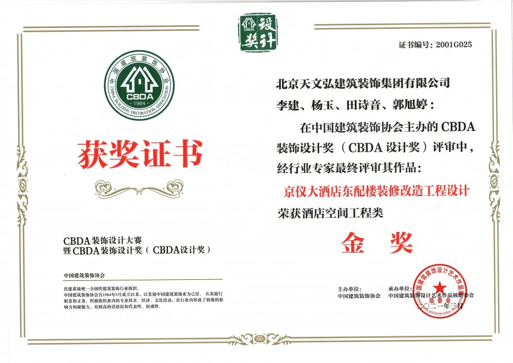 恭喜我司設(shè)計團隊在中國建筑裝飾協(xié)會主辦的 CBDA裝飾設(shè)計獎評審中,經(jīng)行業(yè)專家最終評審其作品“京儀大酒店東配樓裝修改造工程設(shè)計”榮獲酒店空間工程類金獎。